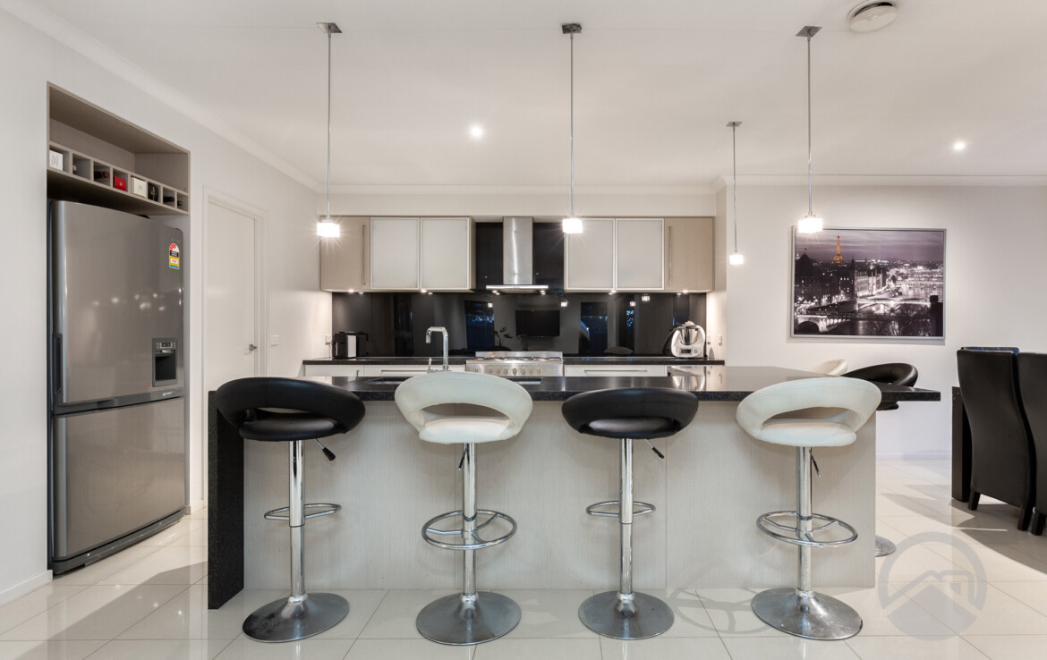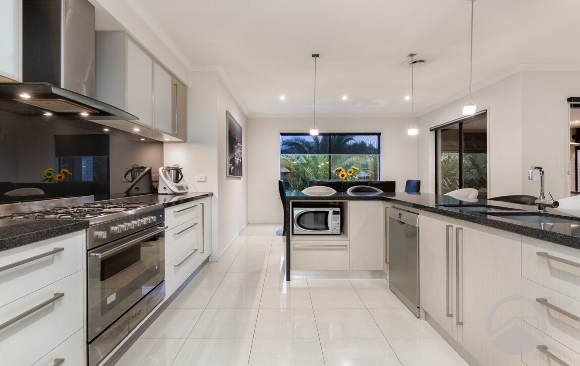 The stunning Caesar stone benched kitchen with under mount modern sink provides a focus for relaxed entertaining within state of the art stainless steel 900ml appliances, light filled, open plan meals and family living areas with a Large Walk in Pantry.